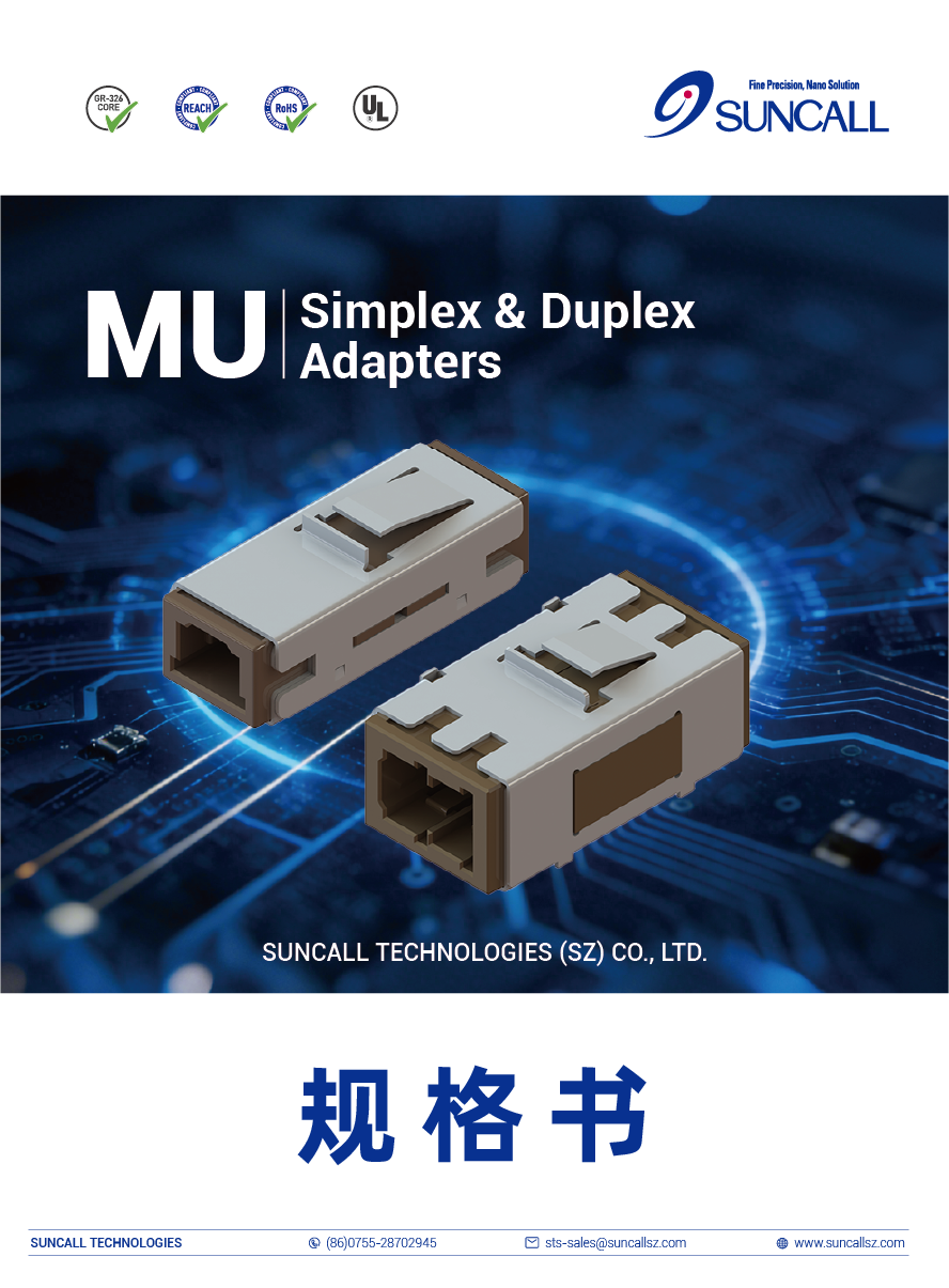 MU シンプレックス・デュプレックスアダプタは SFF 小型タイプで、フランジレスハウジング設計・光学ピッチ 4.5mm、高密度実装に最適。金属スプリングクリップによりパネル実装が簡便で、酸化ジルコニウム製分割スリーブが高精度アライメントを実現。