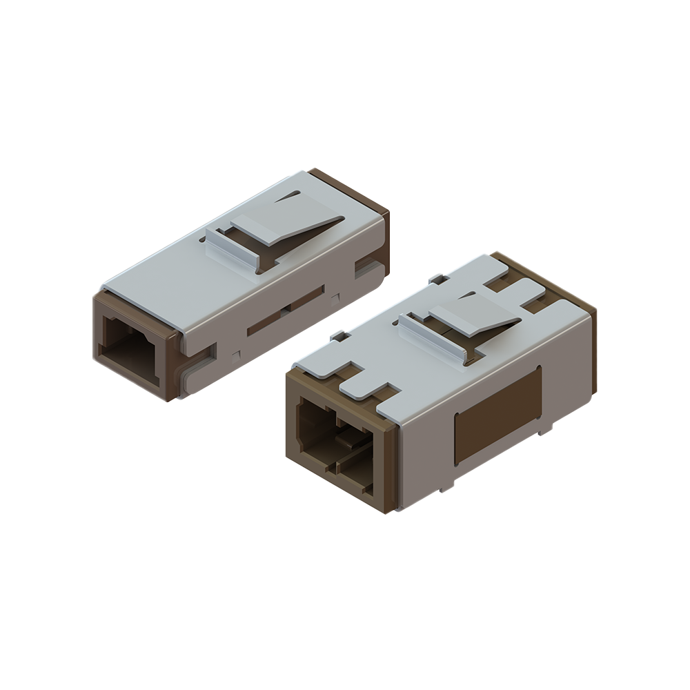 MU シンプレックス・デュプレックスアダプタは SFF 小型タイプで、フランジレスハウジング設計・光学ピッチ 4.5mm、高密度実装に最適。金属スプリングクリップによりパネル実装が簡便で、酸化ジルコニウム製分割スリーブが高精度アライメントを実現。